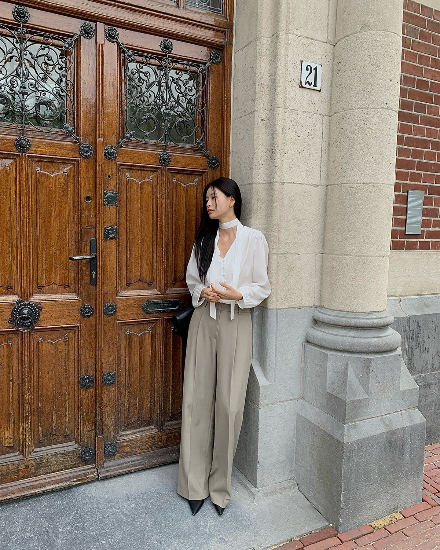 Quần ống rộng dáng dài, nhưng vẫn để lộ phần mũi giày nhọn, giúp vóc dáng trông cao ráo hơn. Giày mũi nhọn có thể là đế bệt hoặc gót thấp, tùy vào nhu cầu di chuyển. Với môi trường công sở, giày mũi nhọn màu đen hoặc be là lựa chọn an toàn. Còn nếu muốn nổi bật hơn, bạn có thể thử các gam màu đậm hoặc họa tiết da báo, hay da bóng để tạo điểm nhấn cho set đồ đơn giản.