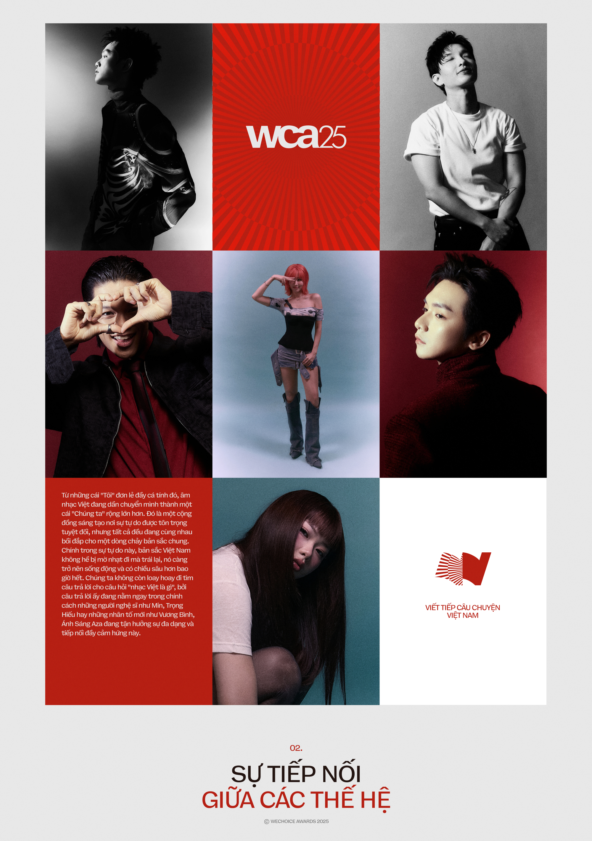 Chính từ nhu cầu được lắng nghe và thấu hiểu những chuyển động âm thầm đó, dự án album của WeChoice Awards hàng năm đã tự thân trở thành một không gian nghệ thuật đầy đặc biệt. Nó không còn là một sản phẩm giải trí thông thường, mà giống như một điểm hẹn của những dòng chảy âm nhạc - nơi những tâm hồn đồng điệu tìm về để cùng nhau kể lại một chương mới của thời đại. Với chủ đề "Viết tiếp câu chuyện Việt Nam", album năm nay không chọn cách phô diễn sức mạnh, mà chọn cách thủ thỉ về sự gắn kết, về một mạch ngầm di sản vẫn đang chảy trôi không ngừng qua các thế hệ.