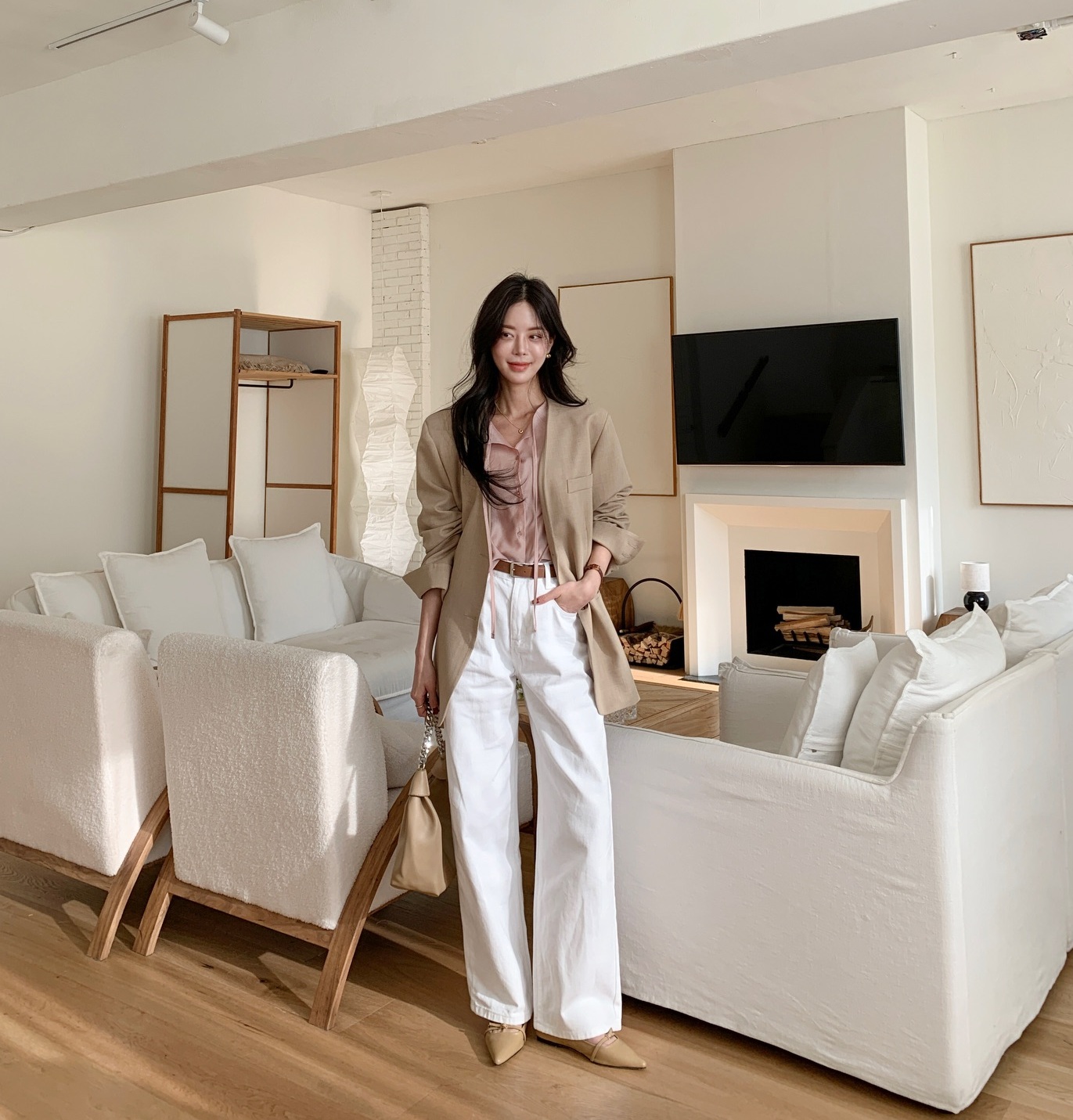 Áo blazer là lựa chọn kinh điển khi nhắc đến việc phối đồ cùng quần ống rộng. Sự chỉn chu, có cấu trúc của blazer giúp cân bằng độ mềm mại và rộng rãi của ống quần, tạo nên tổng thể hài hòa và hiện đại. Với môi trường công sở, một chiếc blazer dáng suông, màu trung tính như đen, xám, be hay nâu nhạt kết hợp cùng quần ống rộng cạp cao sẽ mang lại vẻ ngoài chuyên nghiệp nhưng không hề cứng nhắc.
