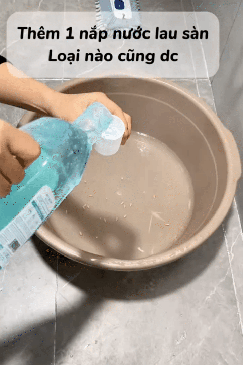 - Pha 1 nắp nước lau sàn (loại nào cũng được) với nước ấm khoảng 70 độ C.