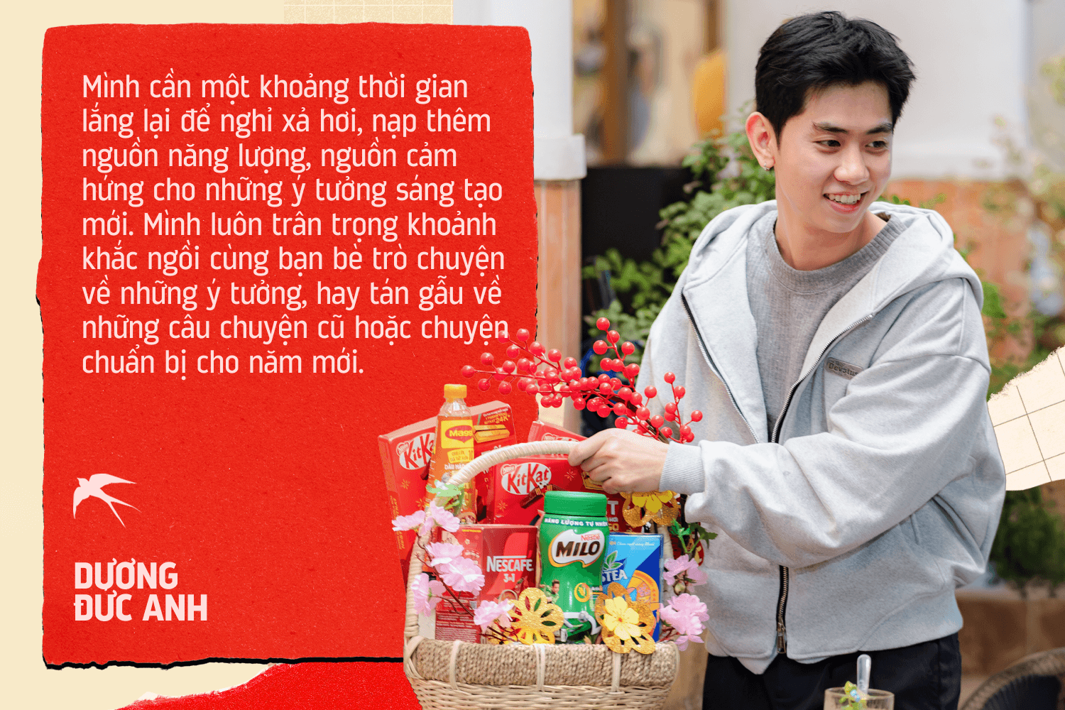 Từ trải nghiệm của bản thân, Tết hiện lên trong lăng kính của Đức Anh theo một cách rất khác. Không phải là kỳ nghỉ dài với lịch trình dày đặc, mà là sự cho phép. Cho phép bản thân chậm lại sau một hành trình dài nỗ lực. Cho phép mình nghỉ xả hơi. Và cho phép sự sáng tạo được trở về trạng thái tự nhiên nhất.
