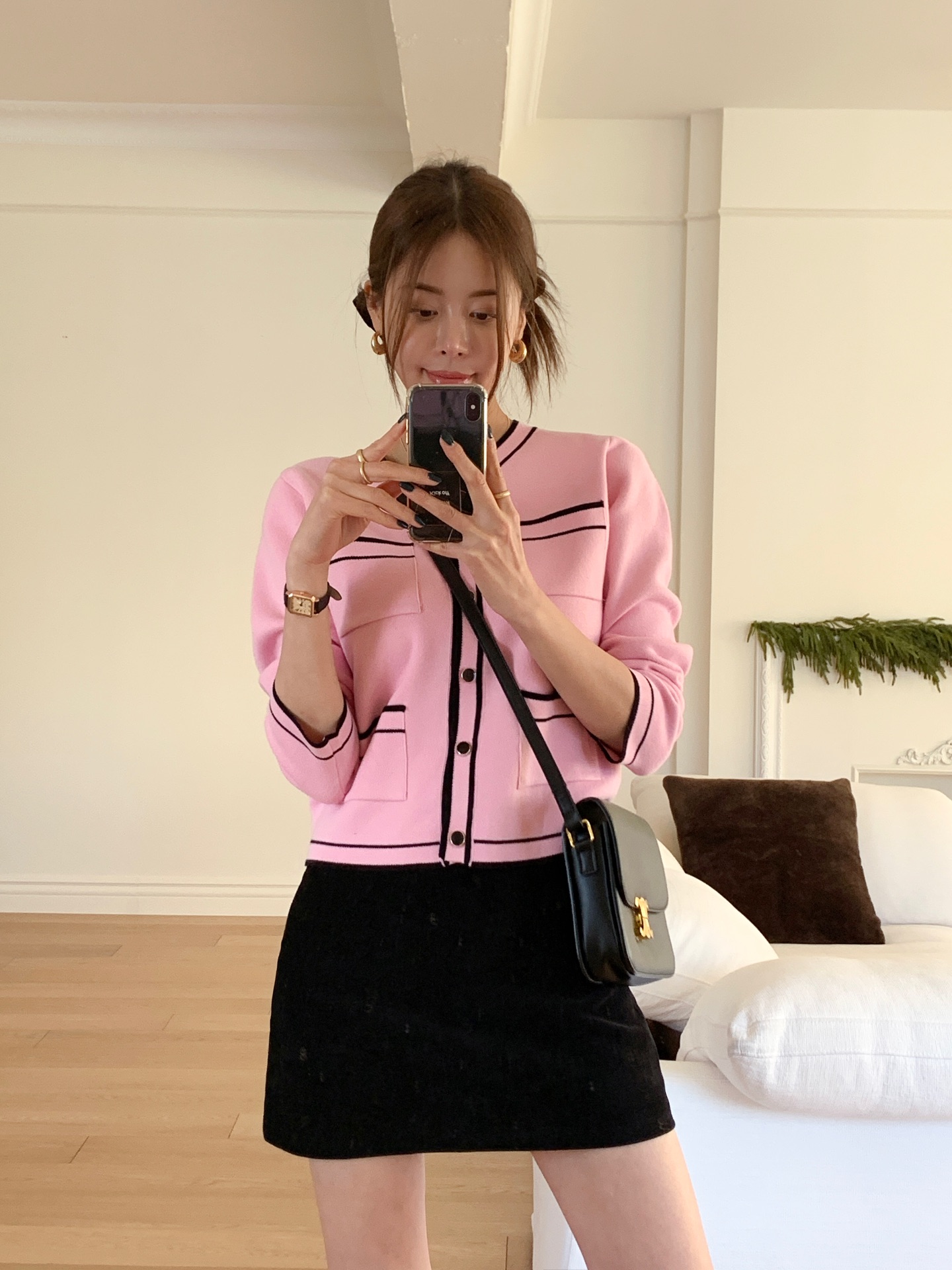 Để mặc chân váy ngắn trong dịp Tết mà không quá "casual", bạn nên kết hợp cùng áo len cộc tay hoặc cardigan. Một đôi boots cổ ngắn, giày mary jane hoặc loafer sẽ giúp tổng thể hài hòa, không bị quá hở hay thiếu tinh tế. Để trông sang hơn nữa, bạn có thể chọn chân váy chất liệu dày dặn hơn như tweed hoặc kaki để vừa đẹp vừa dễ mặc.