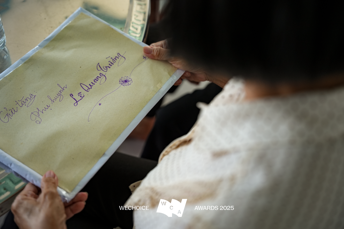Cô Phấn ngồi bên cạnh chỉ đưa tay lật từng trang, nhắc lại từng kỷ niệm nhỏ: Bữa Trường viết được tên mình tròn chữ, bữa em khoe vừa làm xong bài toán khó, bữa em mệt quá nhưng vẫn xin vô lớp ngồi coi bạn học. Cô kể như người ta kể về một người vẫn đang sống đâu đó trong trí nhớ, rất đỗi gần gũi và thân thương.