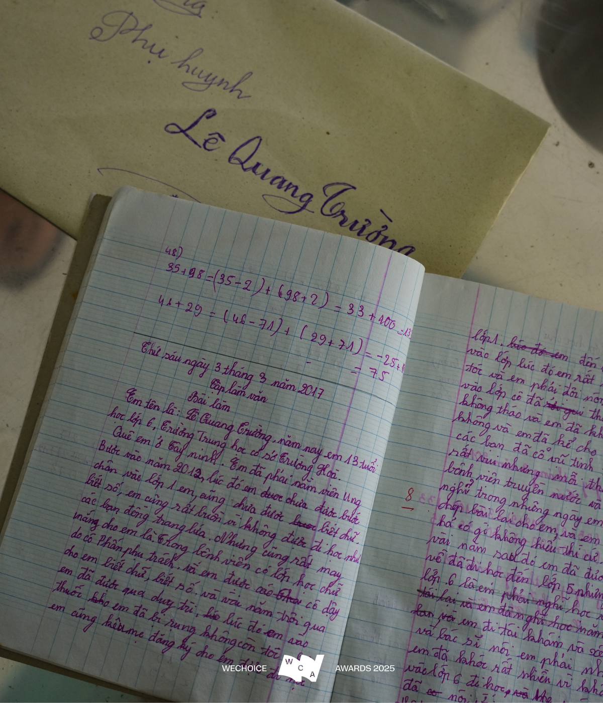Bên trong là cuốn sổ dày là đầy những hình ảnh, bài văn, bài toán của Trường. Trang đầu là hình Trường lúc còn nhỏ, tóc cắt ngắn, mắt sáng ngời trong veo. Bên trong đó là những bài tập đánh vần, từng nét chữ nghiêng ngả như người mới tập đi. Rồi những bài toán xen kẽ bài văn, ngày tháng không liền mạch, có trang cách nhau vài tuần, có trang cách nhau cả tháng. Tôi chợt nhận ra: Cuốn sổ này không chỉ ghi lại việc học, mà ghi lại nhịp sống của một đứa trẻ “đặc biệt”. Ngày Trường khỏe là ngày Trường đến lớp và ghi bài. Sự đứt đoạn ấy, lúc này nhìn lại, buồn hơn bất kỳ lời kể nào.