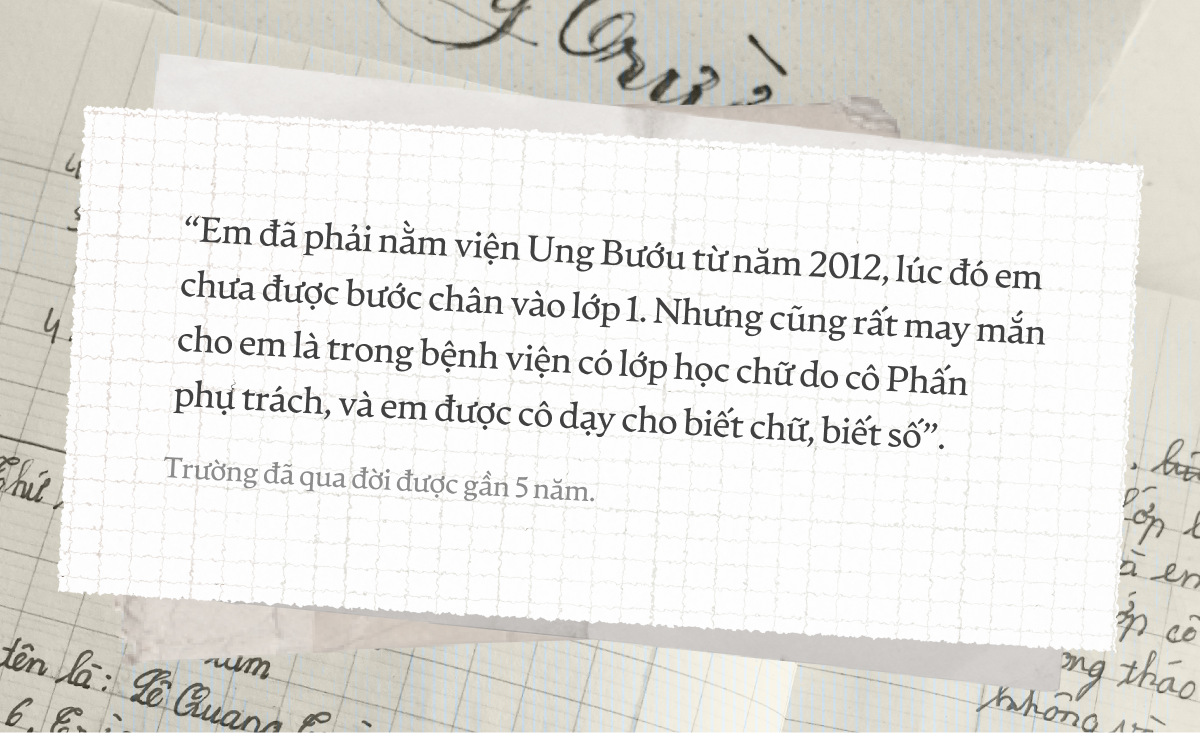 “Em đã phải nằm viện Ung Bướu từ năm 2012, lúc đó em chưa được bước chân vào lớp 1. Nhưng cũng rất may mắn cho em là trong bệnh viện có lớp học chữ do cô Phấn phụ trách, và em được cô dạy cho biết chữ, biết số”.