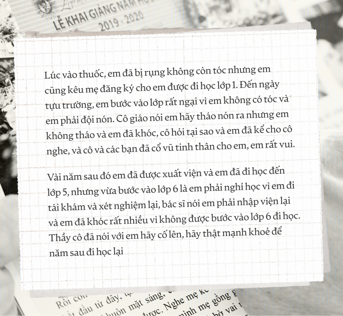 “Lúc vào thuốc, em đã bị rụng không còn tóc nhưng em cũng kêu mẹ đăng ký cho em được đi học lớp 1. Đến ngày tựu trường, em bước vào lớp rất ngại vì em không có tóc và em phải đội nón. Cô giáo nói em hãy tháo nón ra nhưng em không tháo và em đã khóc, cô hỏi tại sao và em đã kể cho cô nghe, và cô và các bạn đã cổ vũ tinh thân cho em, em rất vui. Vài năm sau đó em đã được xuất viện và em đã đi học đến lớp 5, nhưng vừa bước vào lớp 6 là em phải nghỉ học vì em đi tái khám và xét nghiệm lại, bác sĩ nói em phải nhập viện lại và em đã khóc rất nhiều vì không được bước vào lớp 6 đi học. Thầy cô đã nói với em hãy cố lên, hãy thật mạnh khoẻ để năm sau đi học lại”.