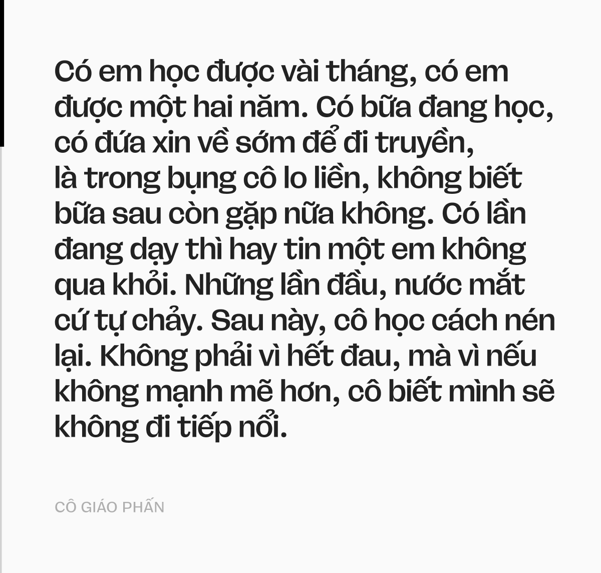 “Có em học được vài tháng, có em được một hai năm. Có bữa đang học, có đứa xin về sớm để đi truyền, là trong bụng cô lo liền, không biết bữa sau còn gặp nữa không. Có lần đang dạy thì hay tin một em không qua khỏi. Những lần đầu, nước mắt cứ tự chảy. Sau này, cô học cách nén lại. Không phải vì hết đau, mà vì nếu không mạnh mẽ hơn, cô biết mình sẽ không đi tiếp nổi.”
