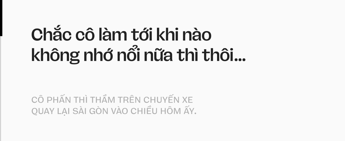 “Chắc cô làm tới khi nào không nhớ nổi nữa thì thôi…” Cô Phấn thì thầm trên chuyến xe quay lại Sài Gòn vào chiều hôm ấy.