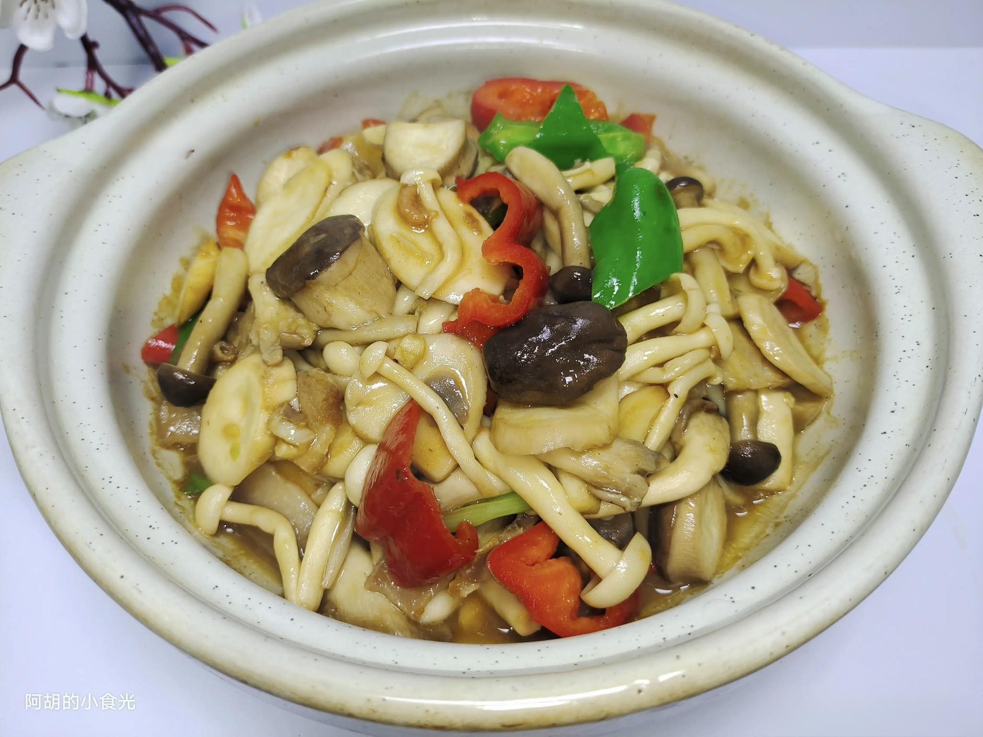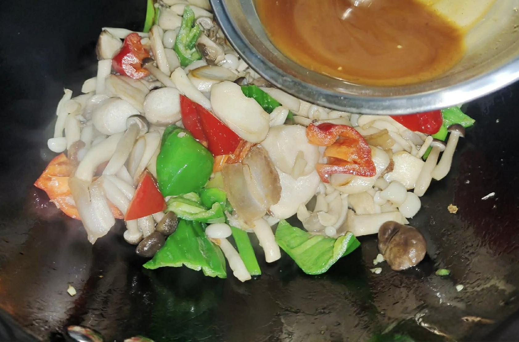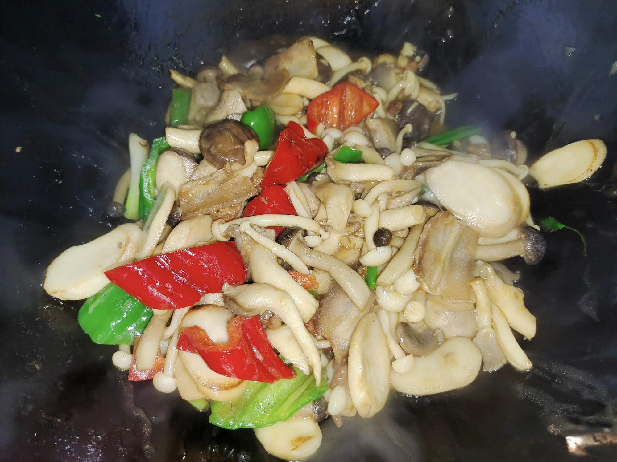 Bước 3: Làm nóng dầu trong chảo. Khi dầu nóng, cho thịt ba chỉ thái lát vào xào đến khi mỡ và mùi thơm tỏa ra. Sau đó cho gốc hành lá, tỏi, tôm khô và ớt chuông xanh, đỏ thái miếng vào xào trên lửa lớn để các nguyên liệu dậy mùi thơm. Sau đó cho tất cả nấm đã sơ chế vào, xào nhanh trên lửa lớn trong vài giây để loại bỏ bớt nước và làm dậy mùi thơm. Sau đó, khuấy đều phần nước sốt đã chuẩn bị và đổ vào nồi. Xào nhanh trên lửa lớn cho đến khi chín đều. Khi các nguyên liệu chín, mùi thơm nức, bạn lấy ra khỏi chảo và bày lên đĩa.