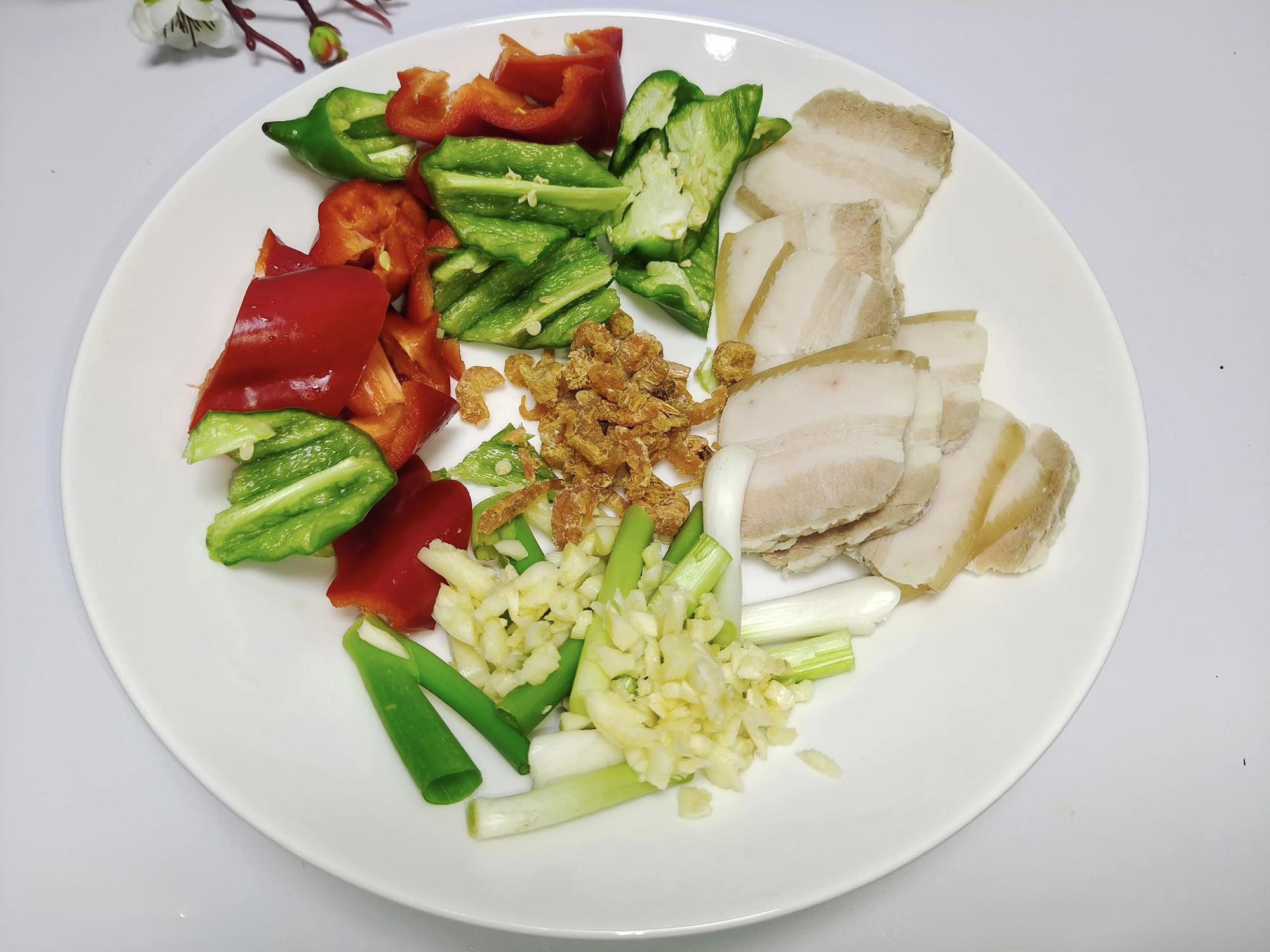 Nấm bào ngư, nấm ngọc châm, nấm hương, nấm đùi gà, nửa quả ớt chuông xanh, nửa quả ớt chuông đỏ, 150g thịt ba chỉ, một ít tôm khô, lượng hành lá và tỏi vừa đủ, lượng nước tương và bột bắp vừa đủ, một chút bột tiêu, muối, dầu hào, một chút bột nêm gà và lượng dầu ăn vừa đủ.