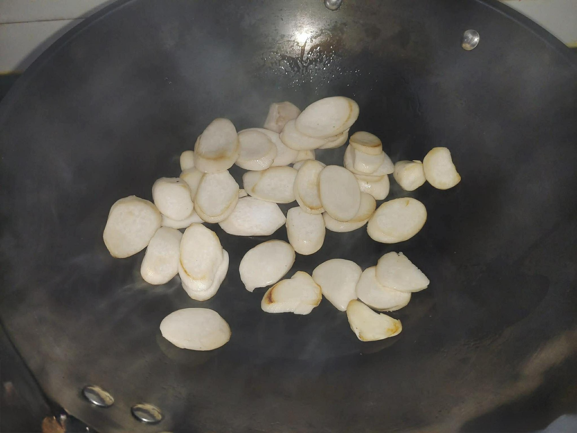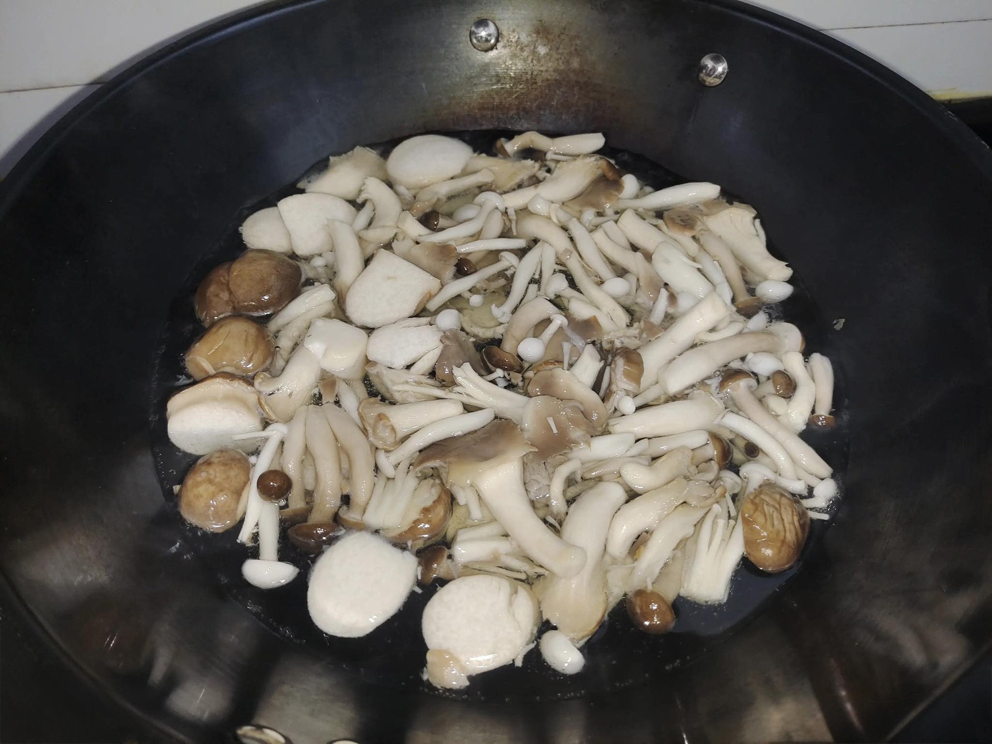 Bước 2: Đặt chảo lên bếp, đun nóng cùng một chút dầu ăn, sau đó cho nấm đùi gà thái lát vào chiên đến khi hơi vàng. Lấy nấm đùi gà ra, để riêng. Tiếp theo, đặt một nồi nước lên bếp, đun sôi trên lửa lớn. Cho các loại nấm còn lại vào chần trong khoảng chảo và đun sôi trên lửa lớn. Cho các loại nấm còn lại vào chần trong 2 phút. Vớt nấm ra và để ráo nước bằng rây. Chuẩn bị một chiếc bát, cho 2 muỗng canh nước tương, 1 muỗng canh dầu hào, một chút muối, bột tiêu và bột nêm gà cho vừa ăn. Sau đó thêm một ít nước và bột bắp rồi khuấy đều là được phần nước sốt cho món xào.