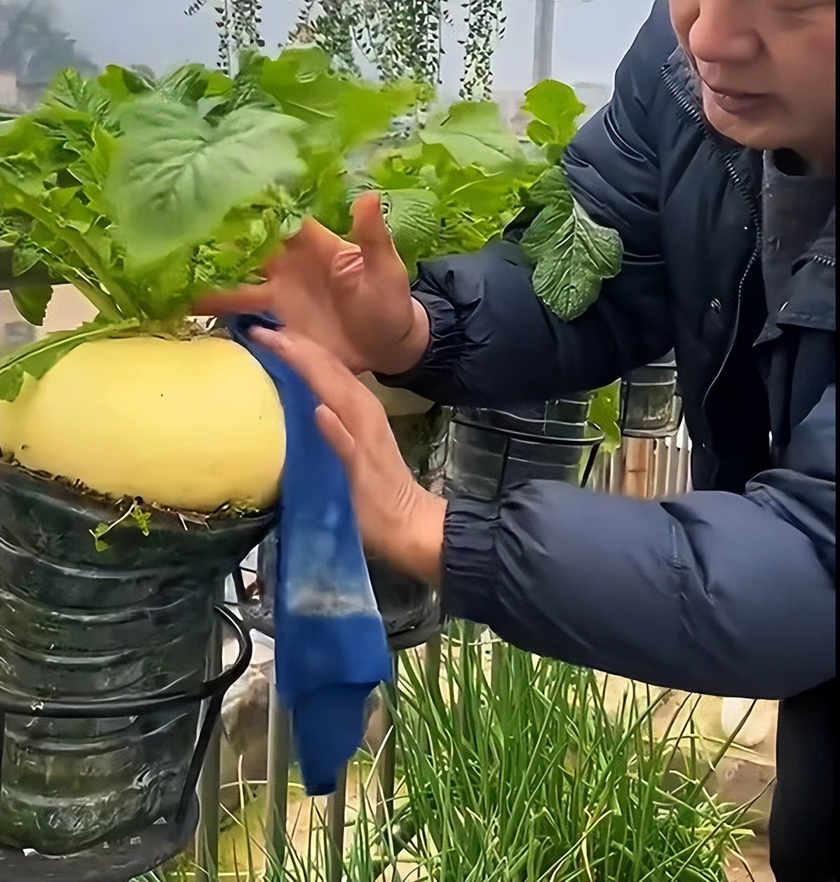 Ông gom những chiếc xô nước khoáng cũ, đục lỗ thoát nước, đổ đất vào và bắt đầu trồng củ cải. Từ những hạt nhỏ xíu, vài ngày sau nhú mầm, rồi dần dần thành những củ tròn đầy sức sống.