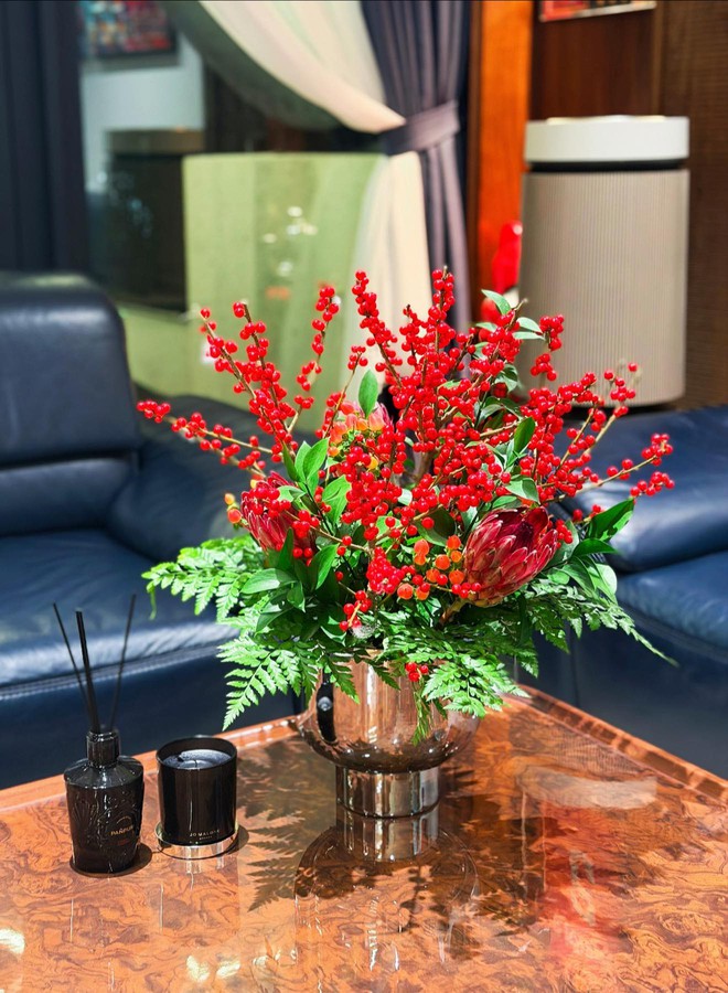 Những ngày đầu năm, căn nhà ngập tràn sắc hoa. Những chậu lan hồ điệp xanh nổi bật được đặt trang trọng trong phòng khách, kết hợp cùng hoa đào và các vật dụng trang trí Tết mang sắc màu rực rỡ. Không khí xuân hiện diện trong từng chi tiết, tạo nên khung cảnh vừa sang xịn vừa gần gũi.
