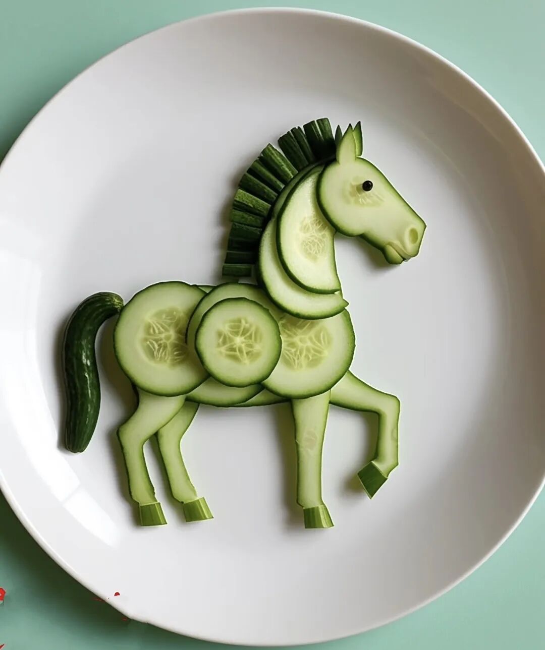 Dưa chuột, với màu xanh tươi tắn và vị thanh mát, vừa tốt cho sức khỏe lại giúp giảm độ ngấy, tượng trưng cho sức sống và sự trường tồn. Xếp dưa chuột thành hình một chú ngựa đang phi nước đại là một cách trang trí đơn giản và dễ thực hiện, chúc năm Ngựa một hành trình đầy hứng khởi, tiến về phía trước và suôn sẻ.