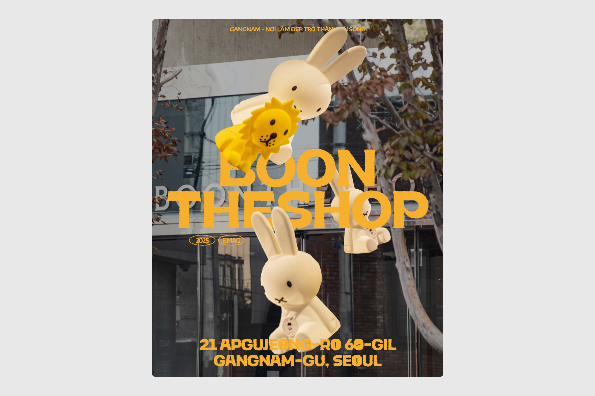 Chủ nhật, Ji-eun thường đi bộ ở Apgujeong - Cheongdam. Nơi đây có những khu phố mà ở đó, thời gian dường như trôi chậm hơn hẳn. Giữa những con đường rợp bóng cây quanh công viên Dosan và các cửa hàng thời trang cao cấp, khái niệm xa xỉ của Seoul hiện lên rất riêng: tự tin kín đáo và quyến rũ trầm lắng.
