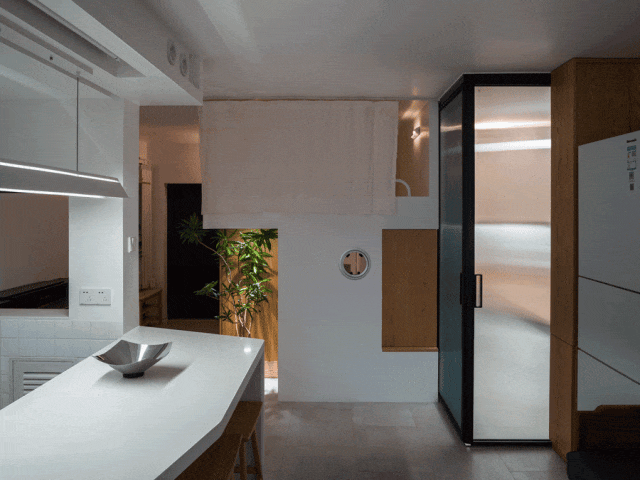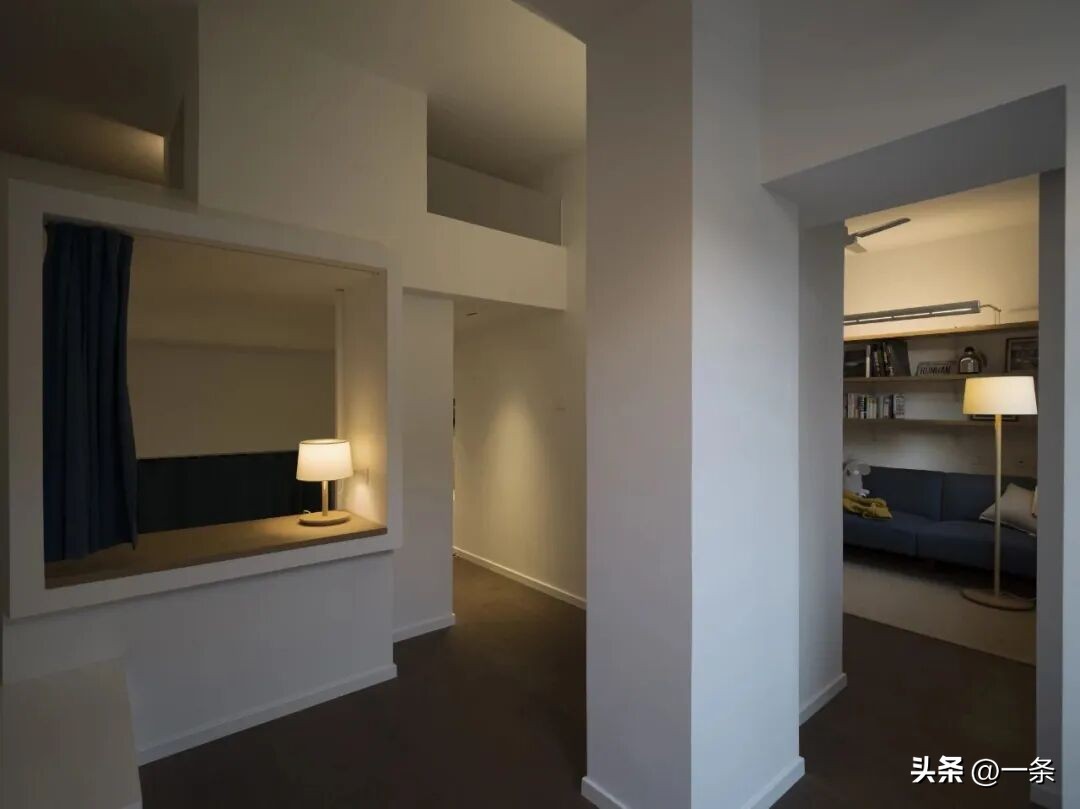Một ô mở trên tường cho phép tương tác thị giác với phòng khách. Khi cần riêng tư, có thể đóng lại.