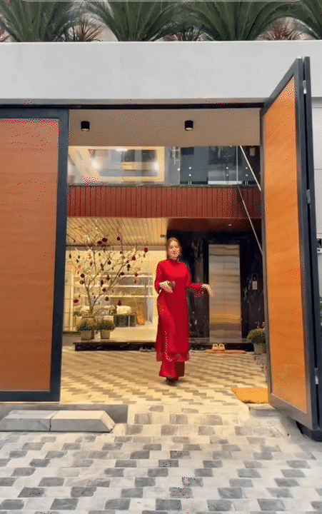 Về kích thước thì mặt tiền nhà là 6m và cánh cổng rộng 4,5m, cổng chia làm 4 cánh. "Chi phí phần cổng khoảng 25 triệu, nhà Thao lắp thêm mô tơ âm sàn của Ý, có thể mở tự động cả 2 cánh hoặc 1 cánh, riêng mô tơ là 37 triệu. Thao có lắp thêm cảm biến dừng an toàn khi đóng mở, bộ vân tay mã số ngoài cổng. Nếu đang đóng mà có người đi qua thì cổng sẽ dừng lại để đảm bảo an toàn.