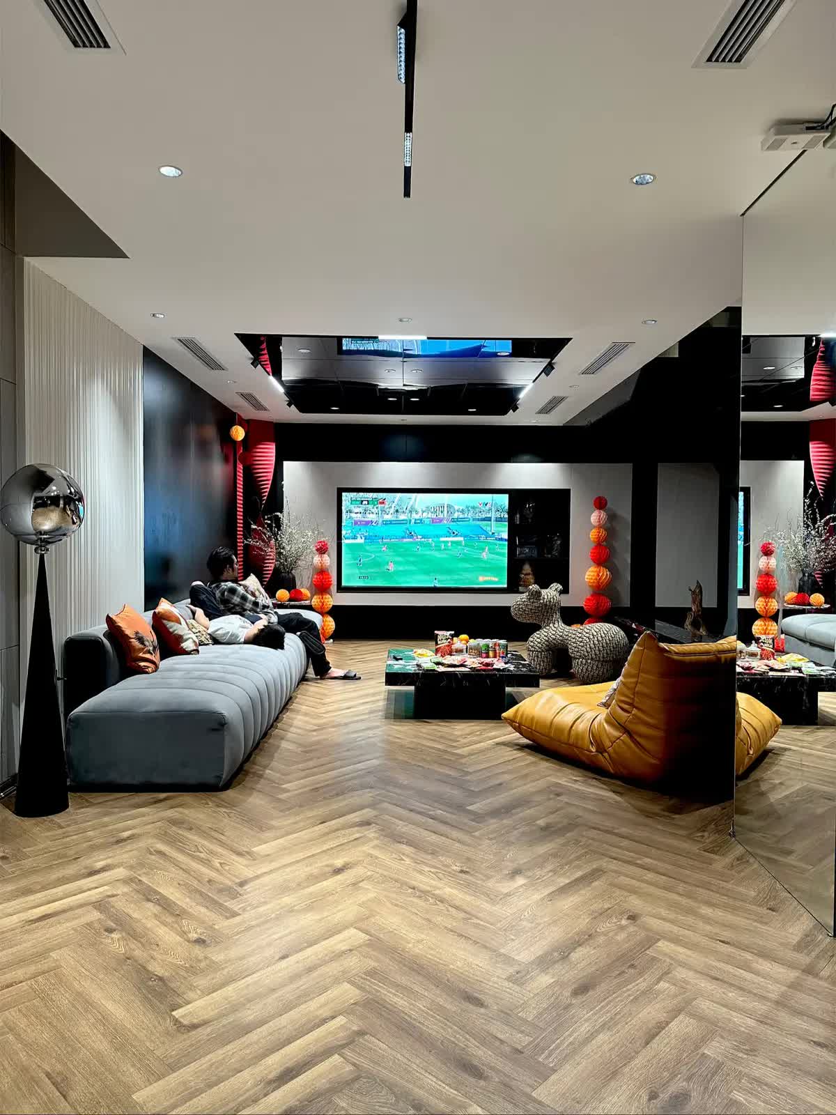 Điểm nhấn nổi bật nhất là bộ sofa dài tới 5m, giúp gia đình thoải mái tiếp đón đông khách mà không lo thiếu chỗ ngồi. Khi nhà có tiệc hay tụ họp, mọi người có thể quây quần bên nhau trong không gian rộng rãi, gần gũi và thân mật.