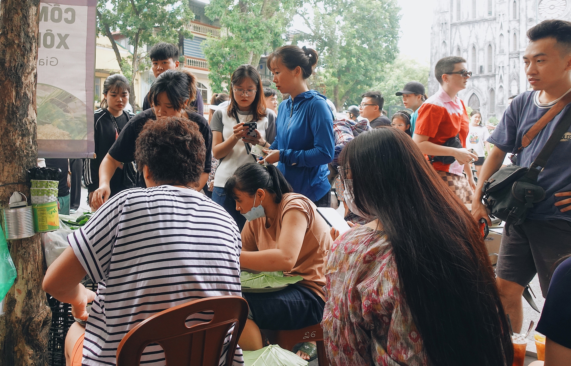 So với những năm trước, mùa thu năm nay, ở quanh khu vực Nhà Thờ đã có thêm nhiều hàng xôi cốm hơn. Dù vậy, vì ai cũng yêu thích món ăn này nên một số hàng xôi cốm vẫn rất đông người mua.