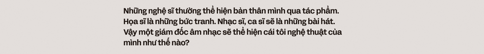 Tôi sẽ thể hiện cái tôi thông qua đường dây âm nhạc trong chương trình của mình. Cách đưa những lựa chọn, màu sắc âm nhạc vào tổng thể. Khán giả sẽ cảm nhận được màu nhạc của mỗi chương trình với các giám đốc âm nhạc khác nhau. Ví dụ: Với một người yêu nhạc dân gian thì chỉ cần xem thôi đã biết ngay. Một người thích nhạc điện tử cũng vậy. Có những người giám đốc âm nhạc yêu jazz cũng sẽ khiến khán giả nhận biết dễ dàng. Cái tôi của giám đốc âm nhạc đến từ góc nhìn bao quát. Sự kiểm soát tác phẩm của họ sẽ mang tính định hướng nhiều hơn khi sản xuất âm nhạc