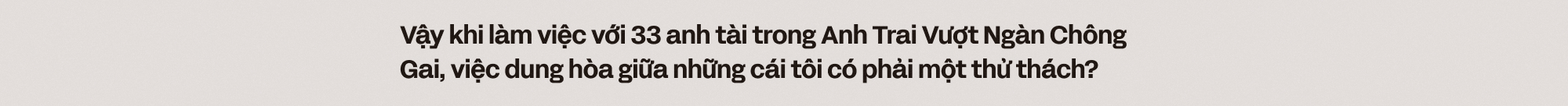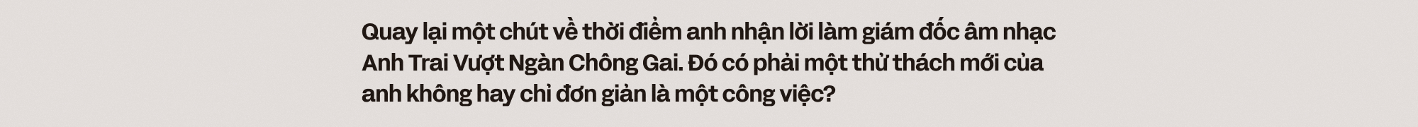 Đúng là một thử thách mới. Trước đây, tôi vốn thích thử sức với vai trò giám đốc âm nhạc . Tôi cũng từng hợp tác để thực hiện chương trình Tết với các Chị Đẹp mùa 1 và đó cũng là phép thử của bản thân. Anh Trai Vượt Ngàn Chông Gai là show chính thức đầu tiên tôi đảm nhiệm vị trí Giám đốc âm nhạc, vậy nên tôi cũng dồn hết sự cố gắng để xem bản thân có thể làm được đến đâu