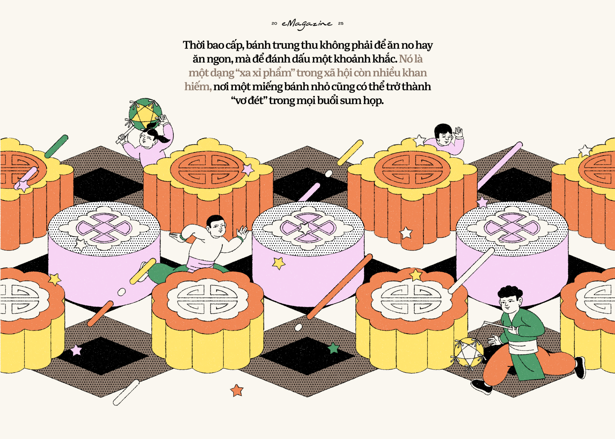 Thời bao cấp, bánh trung thu không phải để ăn no hay ăn ngon, mà để đánh dấu một khoảnh khắc. Nó là một dạng "xa xỉ phẩm" trong xã hội còn nhiều khan hiếm, nơi một miếng bánh nhỏ cũng có thể trở thành "vơ đét" trong mọi buổi sum họp. Chính trong bối cảnh đó, bánh trung thu gắn liền với cảm giác ấm áp và giản dị: Chỉ cần ở bên người thân, có trăng, có bánh là đã trọn vẹn sự đủ đầy.