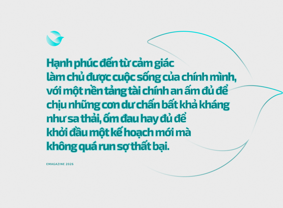 Những khoảnh khắc ấy không ồn ào, chưa xuất chúng. Nhưng chúng đánh dấu một bước chuyển rất quan trọng: từ việc kiếm tiền để sống sang việc quản lý tài chính để sống tốt hơn. Và cũng từ đó, nhiều người bắt đầu nhận ra: hạnh phúc đến từ cảm giác làm chủ được cuộc sống của chính mình, với một nền tảng tài chính an ấm đủ để chịu những cơn dư chấn bất khả kháng như sa thải, ốm đau hay đủ để khởi đầu một kế hoạch mới mà không quá run sợ thất bại.