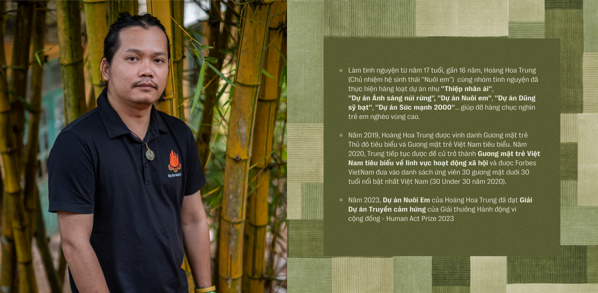 Đó chính là lúc Trung bắt đầu tham gia những tổ chức thiện nguyện, rong ruổi khắp các vùng núi cao để xây trường cho học sinh dân tộc thiểu số. Và đây cũng là thời điểm, Hoàng Hoa Trung bắt đầu lờ mờ có những ý tưởng đầu tiên về một dự án nuôi cơm cho các em nhỏ. Mà sau này, dự án ấy sẽ được gọi với một cái tên thân thương: Nuôi em.