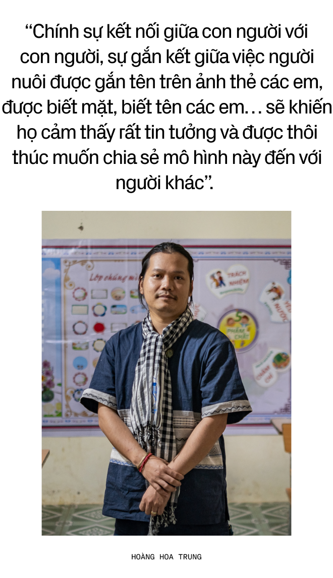"Nuôi em là mô hình 1 em nhỏ sẽ có một người nhận nuôi. Các thầy cô giáo cắm bản sẽ được kết nối cùng người nhận nuôi đó, mỗi tháng một lần họ được cập nhật thông tin với nhau, một năm họ sẽ đi thăm các em một lần. Chính sự kết nối giữa con người với con người, sự gắn kết giữa việc người nuôi được gắn tên trên ảnh thẻ các em, được biết mặt, biết tên các em… sẽ khiến họ cảm thấy rất tin tưởng và được thôi thúc muốn chia sẻ mô hình này đến với người khác".