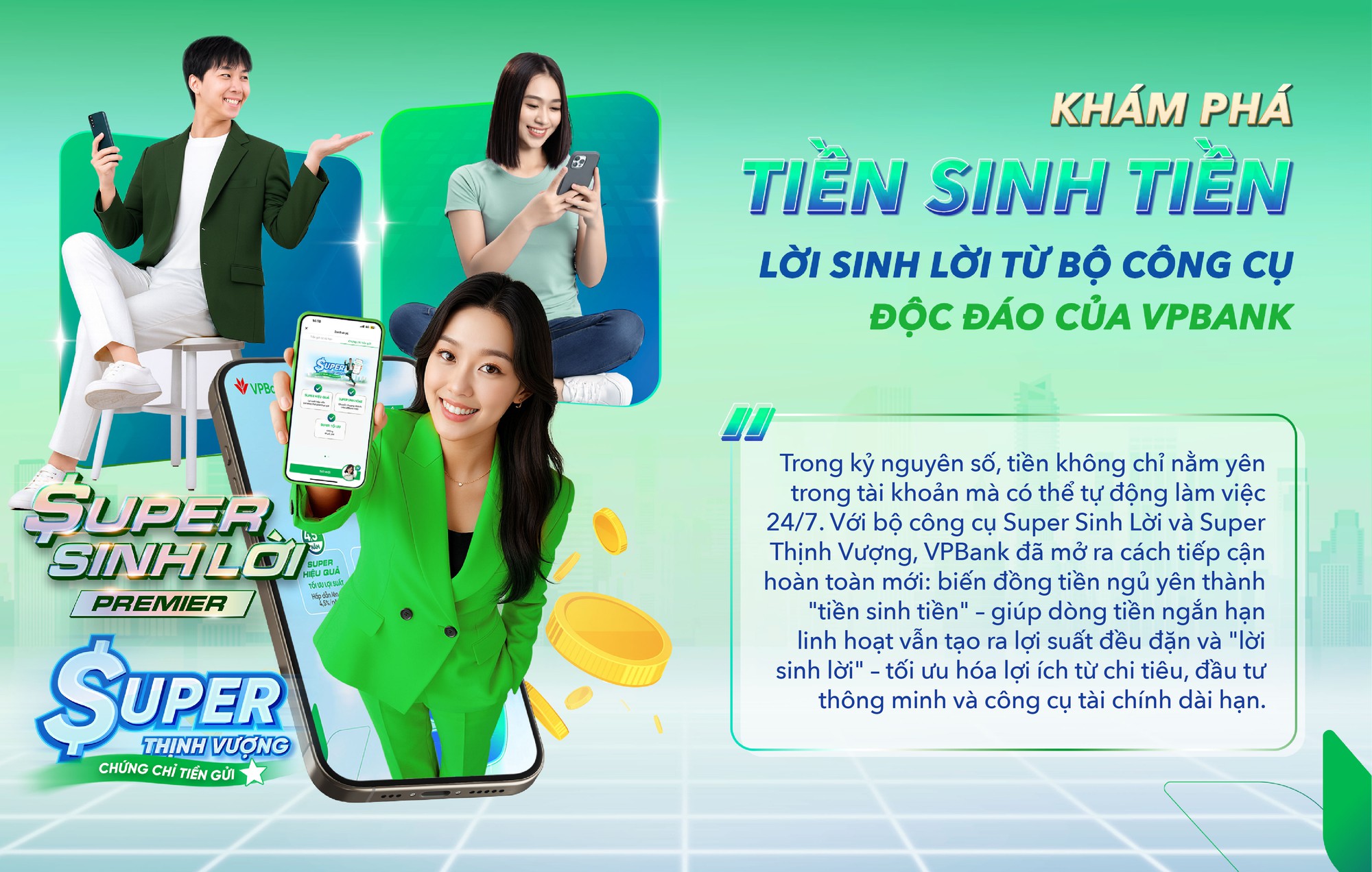 Với bộ công cụ Super Sinh Lời và Super Thịnh Vượng, VPBank đã mở ra cách tiếp cận hoàn toàn mới: biến đồng tiền ngủ yên thành "tiền sinh tiền" – giúp dòng tiền ngắn hạn linh hoạt vẫn tạo ra lợi suất đều đặn và "lời sinh lời" – tối ưu hóa lợi ích từ chi tiêu, đầu tư thông minh và công cụ tài chính dài hạn.