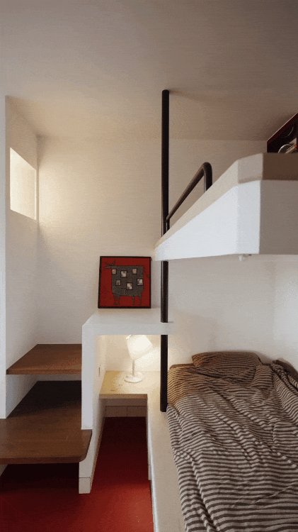 Phòng ngủ chính cũng được xử lý theo tư duy tối ưu diện tích. Thay vì giường đôi chiếm trọn không gian, họ chuyển thành giường tầng lệch. Tầng dưới vẫn đủ rộng cho hai người, tầng trên dành cho nghỉ ngơi riêng tư.