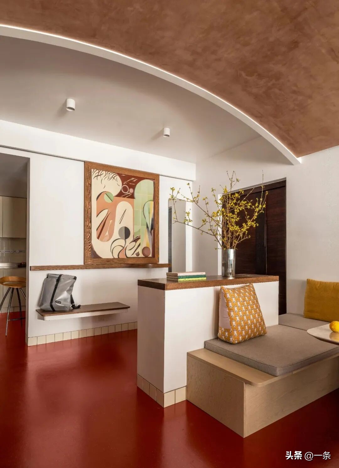 Gia chủ không muốn một chiếc sofa lớn kèm tivi – vì họ không có thói quen xem tivi. Thay vào đó là một chiếc bàn lớn, khu ghế ngồi kiểu quầy bar, trần vòm hạ thấp tạo cảm giác ấm cúng.