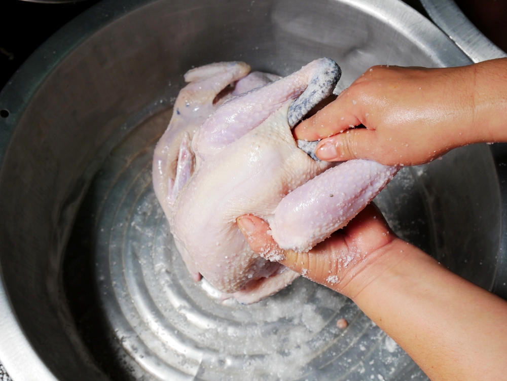 Trước khi luộc, hãy dành vài phút “massage” cho gà. Sau khi làm sạch, dùng muối hạt chà xát khắp thân gà trong khoảng 2–3 phút, rồi ngâm gà trong nước muối loãng 20–30 phút. Công đoạn này giúp khử mùi, làm da săn hơn và giúp thịt đậm vị tự nhiên, không cần nêm nếm cầu kỳ khi luộc.
