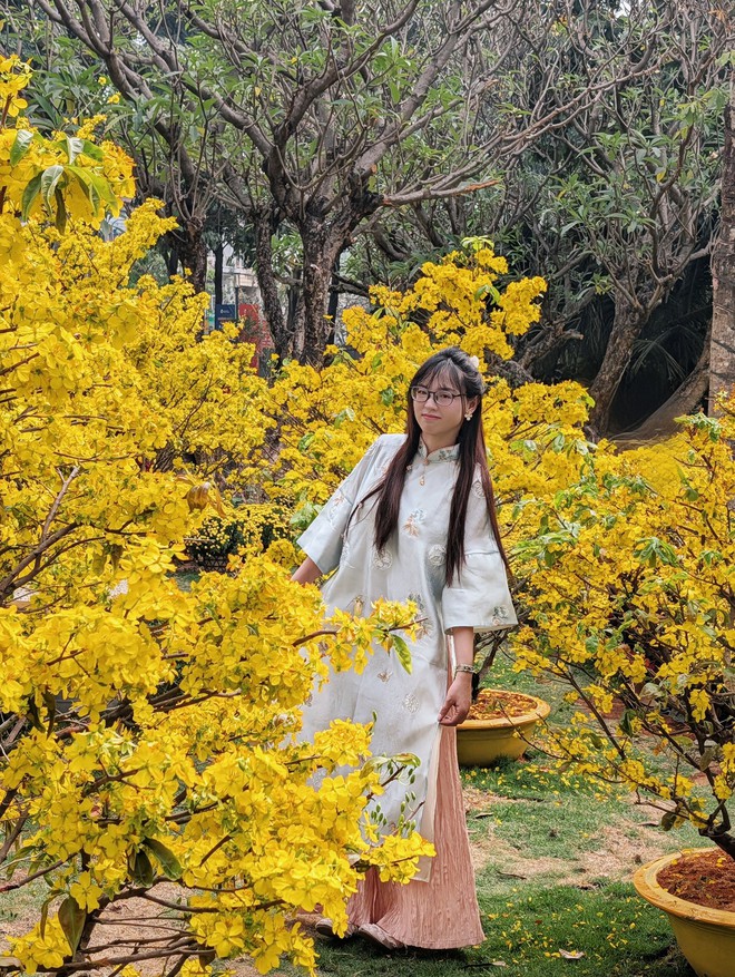 Không chỉ thu hút bởi sự tĩnh lặng và thiêng liêng, công viên còn là thiên đường cho những tín đồ đam mê nhiếp ảnh nhờ vô số góc check in đẹp. Dọc các lối đi, những thảm hoa cúc vàng rực rỡ được chăm chút tỉ mỉ đang bung nở đón xuân, tạo nên phông nền hoàn hảo cho các bạn trẻ xúng xính áo dài thả dáng.