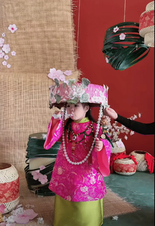 Cả hai bé đều diện thiết kế áo dài Phấn Lĩnh màu hồng nổi bật của BÉ CUP BÔNG, thiết kế được yêu thích nhờ phom dáng truyền thống kết hợp cùng màu sắc rực rỡ, tươi vui rộn ràng không khí Tết.
