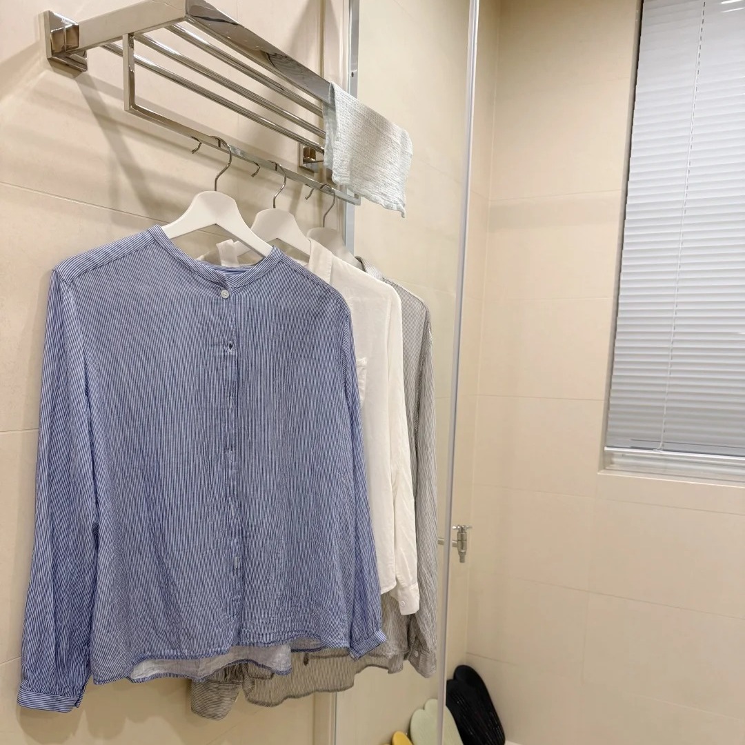 Sau khi tắm xong, mẹ dùng gạt nước lau sạch tường, kính và sàn. Vòi nước inox được lau khô bằng khăn mềm để không đọng vệt. Bồn rửa được lau lại một lần để tránh ố vàng.