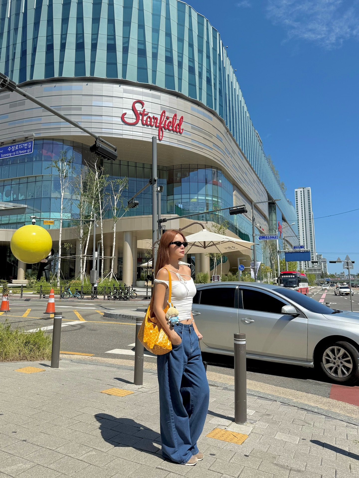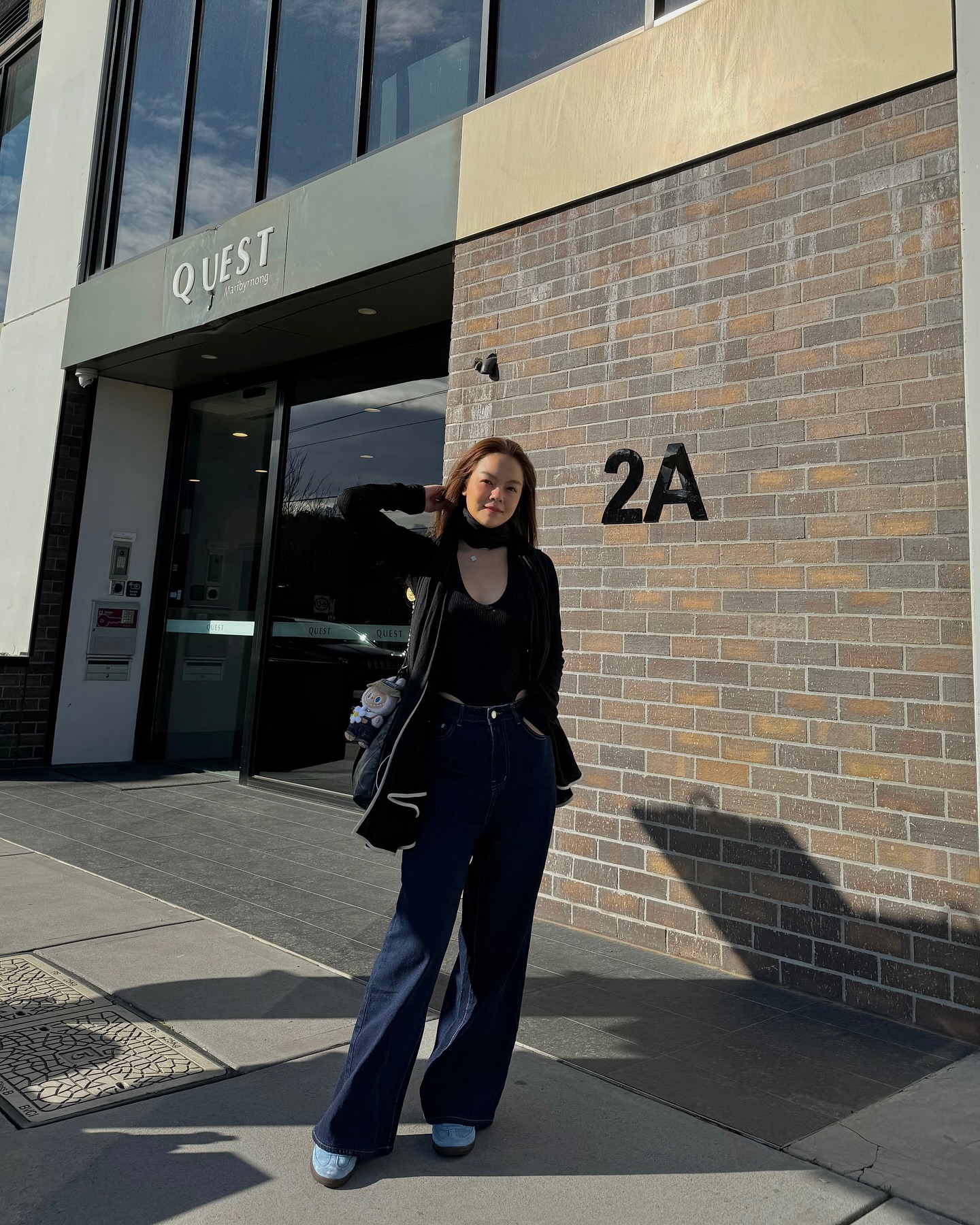 Khi phối cùng jeans cạp cao, tổng thể vừa cân đối vừa tôn lên vòng eo. Cô thường chọn áo trễ vai màu trắng hoặc xám để giữ nét sang trọng. Thay vì phụ kiện rườm rà, nữ ca sĩ ưu tiên vòng cổ mảnh, đủ để tạo điểm nhấn mà không làm outfit mất đi sự tinh tế.