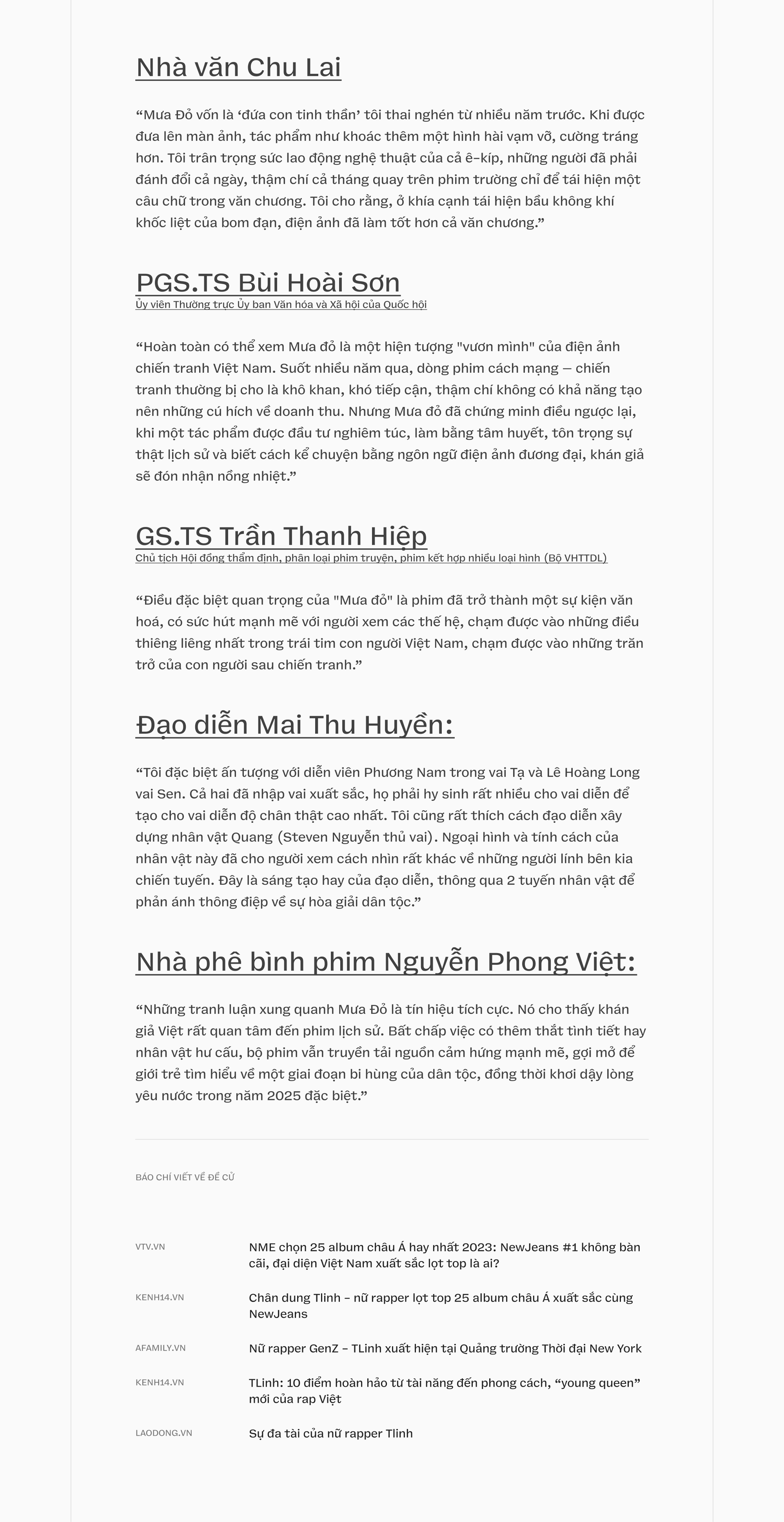 Những dự án quy mô lớn như Mưa Đỏ đang tiếp tục được Điện ảnh Quân đội nhân dân nói riêng và các đơn vị sản xuất phim nói chung đặt trong kế hoạch dài hạn 3 - 5 năm, với nguồn lực đầu tư nghiêm túc. Có như vậy, lịch sử mới thật sự sống lại khi người làm phim đủ tận tâm để lắng nghe, đủ chỉn chu để không “câu view” dễ dãi, và đủ tử tế để đặt tính nhân văn vào trung tâm của câu chuyện. Quá khứ sẽ không còn nằm yên trong sách vở mà tiếp tục hiện diện bền bỉ, trên màn ảnh rộng và trong tâm thức của khán giả hôm nay và mai sau.