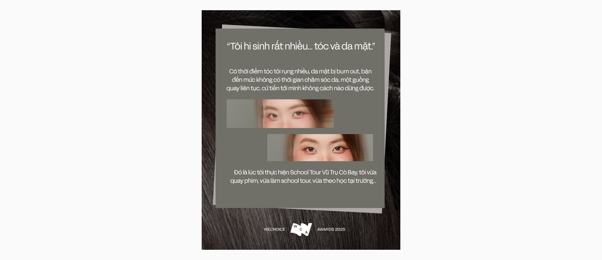 Trò chuyện với chúng tôi, Phương Mỹ Chi cho biết đây là thời điểm mà sức khỏe về thể chất và tinh thần của cô xuống dốc rõ rệt: "Tôi hi sinh rất nhiều… tóc và da mặt. Có thời điểm tóc tôi rụng nhiều, da mặt bị burn out, bận đến mức không có thời gian chăm sóc da, một guồng quay liên tục, cứ tiến tới mình không cách nào dừng được. Đó là lúc tôi thực hiện School Tour Vũ Trụ Cò Bay, tôi vừa quay phim, vừa làm school tour, vừa theo học tại trường…".