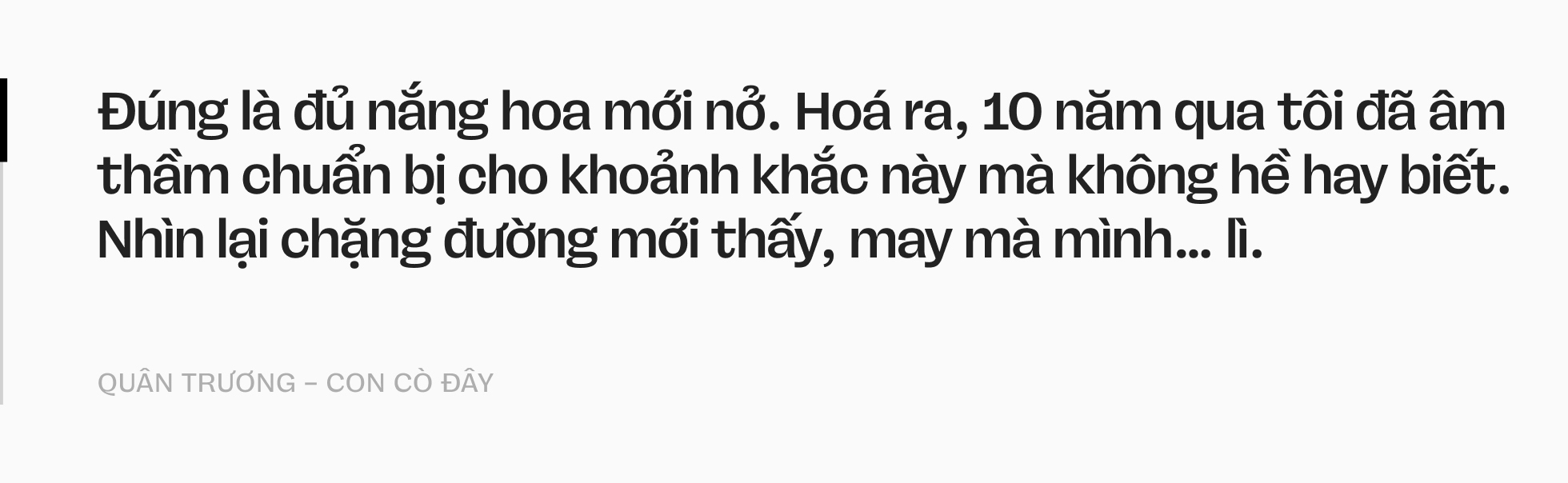 Câu chuyện của Quân là một hành trình thật đẹp về niềm tin và sự kiên định: Khi bạn đủ thông minh để hiểu cuộc đời và đủ kiên trì để không bỏ cuộc, thì ngay cả khi bạn là một "con cò" thấp bé, bạn vẫn có thể tự tạo ra một bầu trời cho riêng mình.