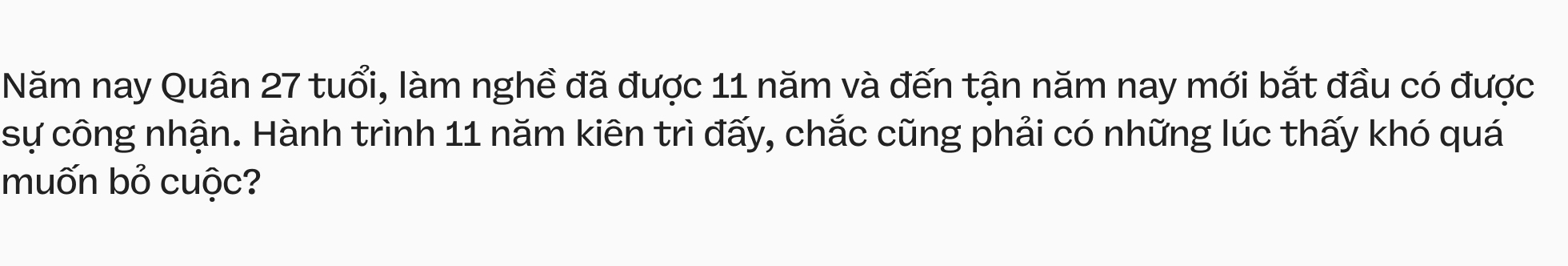 Người ta gọi cậu là một TikToker mới nổi, nhưng thực tế, Quân đã dành 11 năm để đợi khoảnh khắc này. Đó là một hành trình đi vòng dài đằng đẵng. Ước mơ làm diễn viên nhưng thiếu ngoại hình. Đam mê diễn xuất nên chọn quay clip TikTok. Và để nuôi TikTok thì lại phải làm nhân viên văn phòng. một cậu thanh niên tỉnh táo đến mức khi ở đỉnh cao danh vọng vẫn sẵn sàng xách cặp đi học lại từ đầu để trở thành diễn viên thực lực. Một người con đủ bao dung để một mình gánh vác cho cả gia đình và lặng lẽ kết nối lại những đứt gãy với mẹ.