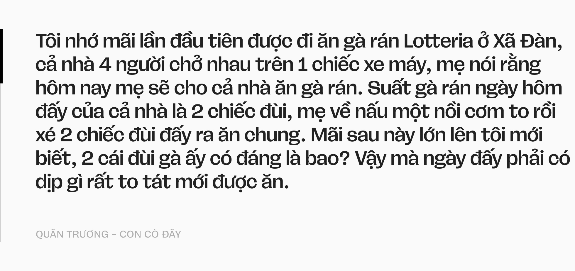 Ngay từ khi biết nhận thức là tôi đã biết điều đó rồi. Sách vở mỗi năm học mới đều là do mẹ đi xin từ họ hàng. Mẹ cũng hay nói với tôi là nhà mình không có tiền đâu, nhà mình nghèo lắm. Khi còn bé thì cũng không tin, cho đến khi thấy mình phải học sách cũ, mặc quần áo hàng thùng thì mới nhận ra là mình nghèo thật. Tôi nhớ mãi lần đầu tiên được đi ăn gà rán Lotteria ở Xã Đàn, cả nhà 4 người chở nhau trên 1 chiếc xe máy, mẹ nói rằng hôm nay mẹ sẽ cho cả nhà ăn gà rán. Suất gà rán ngày hôm đấy của cả nhà là 2 chiếc đùi, mẹ về nấu một nồi cơm to rồi xé 2 chiếc đùi đấy ra ăn chung. Mãi sau này lớn lên tôi mới biết, 2 cái đùi gà ấy có đáng là bao? Vậy mà ngày đấy phải có dịp gì rất to tát mới được ăn.
