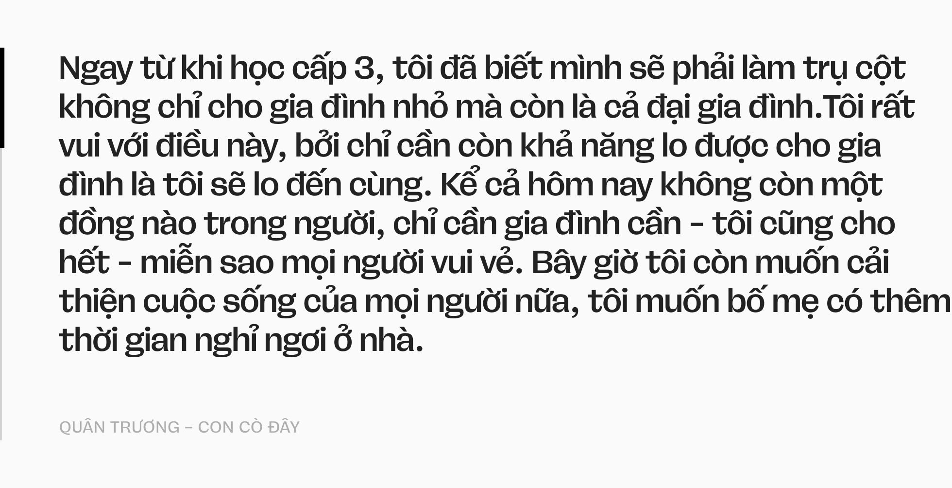 Ngay từ khi học cấp 3, tôi đã biết mình sẽ phải làm trụ cột không chỉ cho gia đình nhỏ mà còn là cả đại gia đình.Tôi rất vui với điều này, bởi chỉ cần còn khả năng lo được cho gia đình là tôi sẽ lo đến cùng. Kể cả hôm nay không còn một đồng nào trong người, chỉ cần gia đình cần - tôi cũng cho hết - miễn sao mọi người vui vẻ. Bây giờ tôi còn muốn cải thiện cuộc sống của mọi người nữa, tôi muốn bố mẹ có thêm thời gian nghỉ ngơi ở nhà.