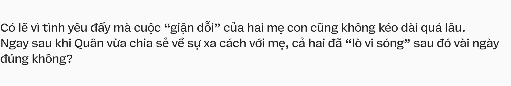 Cuộc "lò vi sóng" đó cũng do nhiều người tác động. Tôi vốn là một người rất nguyên tắc. Khi có vấn đề với mẹ, tôi cho mình deadline là đến hết Tết mới hết dỗi. Thế rồi tôi lại cứ nghĩ quẩn quanh, có những thành tựu mình đạt được mà lẽ ra gia đình sẽ có mặt ở đấy với mình. Và nếu mình cứ cứng nhắc như thế thì khi khoảnh khắc ấy đi qua, liệu biết đến bao giờ mới có lần sau? Cho đến khi thấy tôi trên livestream, mẹ đã chủ động nhắn tin cho tôi trước.