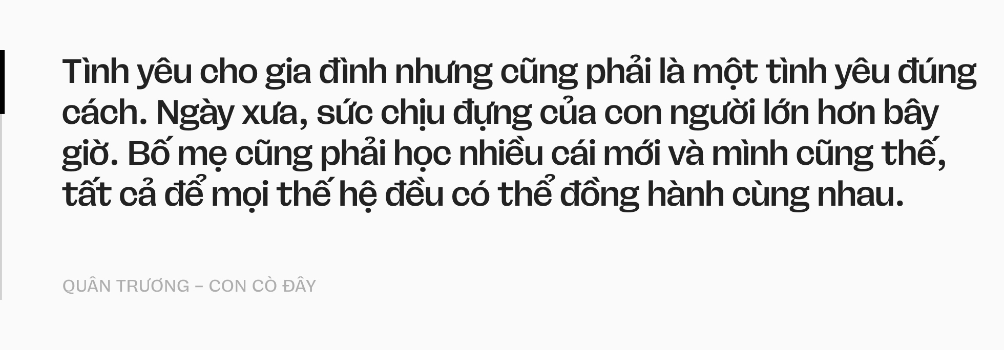 Tình yêu cho gia đình nhưng cũng phải là một tình yêu đúng cách. Ngày xưa, sức chịu đựng của con người lớn hơn bây giờ. Bố mẹ cũng phải học nhiều cái mới và mình cũng thế, tất cả để mọi thế hệ đều có thể đồng hành cùng nhau.