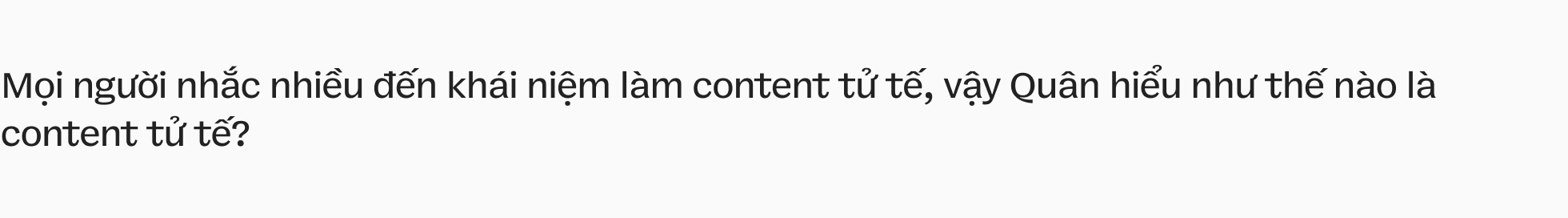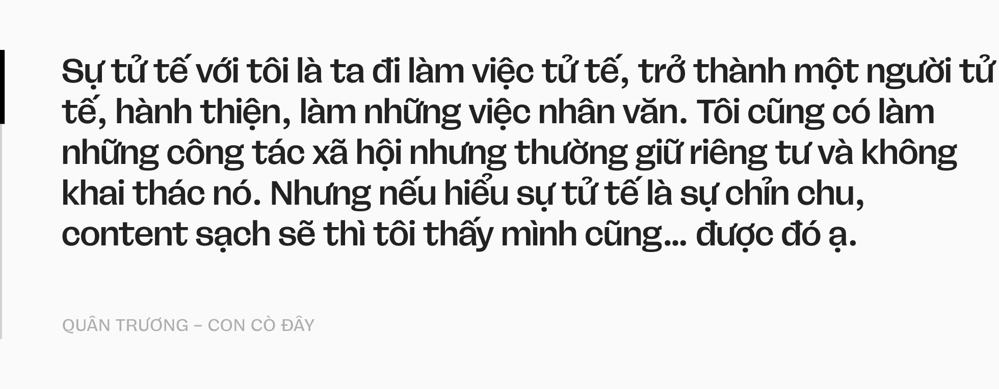 Tôi nghĩ mỗi người lại có một kiểu tử tế khác nhau. Tôi thấy mình chưa phải một người làm content tử tế đâu. Sự tử tế với tôi là ta đi làm việc tử tế, trở thành một người tử tế, hành thiện, làm những việc nhân văn. Tôi cũng có làm những công tác xã hội nhưng thường giữ riêng tư và không khai thác nó. Nhưng nếu hiểu sự tử tế là sự chỉn chu, content sạch sẽ thì tôi thấy mình cũng… được đó ạ.
