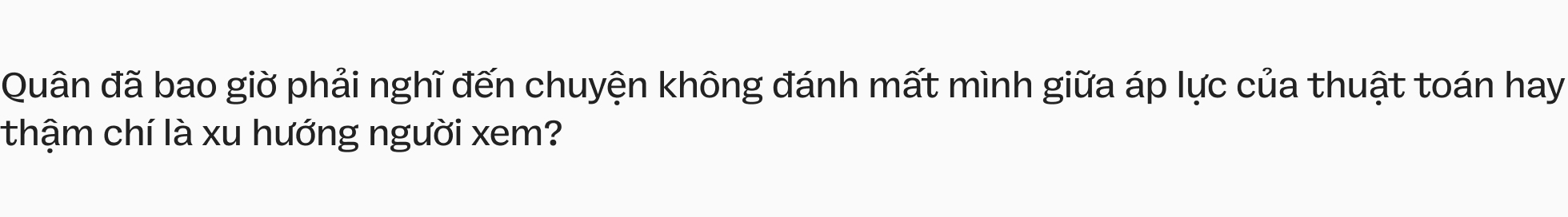 10 năm qua, tôi nghĩ mình chưa bao giờ đánh mất mình. Có khi video chưa có nổi 10k view nhưng tôi vẫn vậy. Quan trọng là khi làm nội dung, tôi cảm thấy rất tâm đắc với nội dung đấy. Tôi đặt chất lượng và sự hài lòng của bản thân lên trên việc có view. Nếu khán giả chưa thích mình thì liệu mình đổi sang nội dung khác họ có thích mình không? Nhiều view bây giờ dễ mà, nhưng làm nội dung có giá trị và ra cơ hội việc làm mới là khó.
