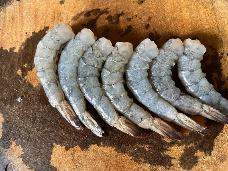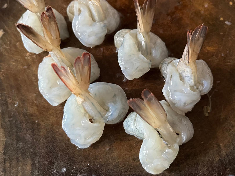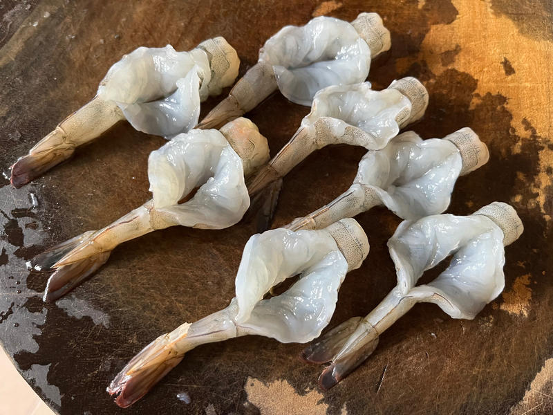 Bước 2: Loại bỏ đầu và vỏ tôm, giữ nguyên phần vỏ đuôi. Bạn có thể dùng kéo để cắt phần vỏ này. Dùng dao rạch dọc sống lưng tôm.