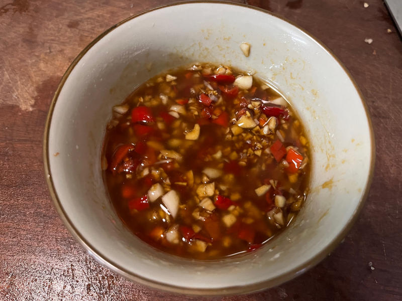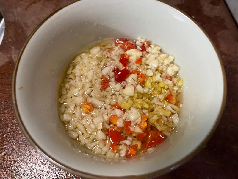 Bước 1: Bóc vỏ tỏi sau đó băm nhỏ cùng với ớt bằng dụng cụ xay tỏi (nếu không có dụng cụ ép tỏi, bạn có thể băm bằng dao, tỏi băm nhỏ sẽ giúp hương vị thơm ngon hơn). Cho tỏi băm vào bát, đun nóng 1 thìa canh dầu ăn (khoảng 70% độ nóng, bắt đầu bốc khói nhẹ) rồi đổ vào tỏi băm cho đến khi nghe thấy tiếng xèo xèo. Khi dầu còn nóng, cho thêm nước tương, dầu hào, muối vừa ăn và đường. Đường là thành phần quan trọng giúp tăng hương vị, vì vậy đừng bỏ qua bước này. Lấy một đĩa sâu lòng và xếp miến đã ngâm thành vòng tròn ở đáy đĩa, giống như tổ chim.