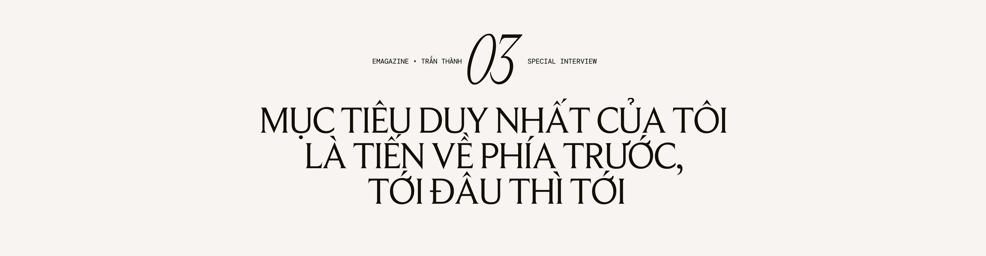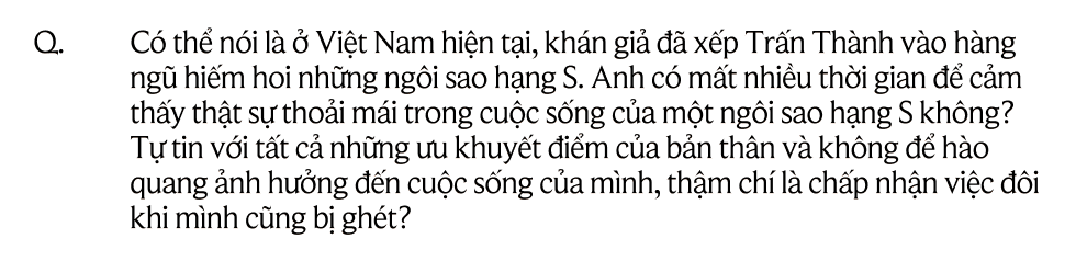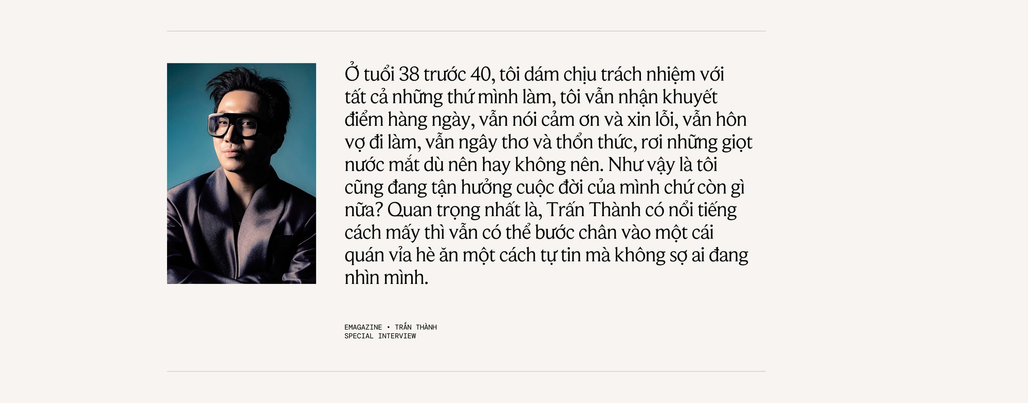 Ở tuổi 38 trước 40, tôi dám chịu trách nhiệm với tất cả những thứ mình làm, tôi vẫn nhận khuyết điểm hàng ngày, vẫn nói cảm ơn và xin lỗi, vẫn hôn vợ đi làm, vẫn ngây thơ và thổn thức, rơi những giọt nước mắt dù nên hay không nên. Như vậy là tôi cũng đang tận hưởng cuộc đời của mình chứ còn gì nữa? Quan trọng nhất là, Trấn Thành có nổi tiếng cách mấy thì vẫn có thể bước chân vào một cái quán vỉa hè ăn một cách tự tin mà không sợ ai đang nhìn mình. Tôi nghĩ khó có một celeb nào chịu làm như vậy, chắc cũng có đó nhưng không nhiều đâu. Nổi tiếng thì cũng là mình thôi chứ, và tôi không ngại một điều gì cả. Trấn Thành có thể sẽ là rất nhiều của một người đang yêu thương Trấn Thành, nhưng sẽ không là gì cả với một người không yêu thương Trấn Thành. Vậy nên tôi tập cho mình một lối suy nghĩ thật đơn giản, không cho mình là cái gì hết - và điều đó giúp tôi không có áp lực trong cuộc sống để tận hưởng mọi giây phút trôi qua.
